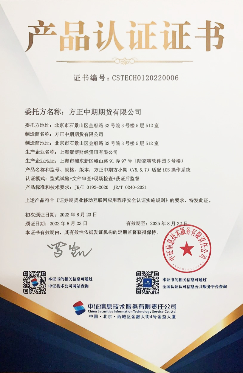 此次認證,由證券期貨業(yè)機構提供專(zhuān)業(yè)認證服務(wù)的——中證信息技術(shù)服務(wù)有限責任公司,以及大連商品交易所全資子公司——大商所飛泰測試技術(shù)有限公司聯(lián)合進(jìn)行,在兩家權威機構的專(zhuān)業(yè)測評下,公司結合專(zhuān)業(yè)機構的意見(jiàn)與建議,對方小期A(yíng)PP進(jìn)行了優(yōu)化升級,使得方小期A(yíng)PP更安全、更可靠、更穩定,投資者在使用方正中期方小期A(yíng)PP時(shí),個(gè)人隱私信息能得到更有效的安全保護。