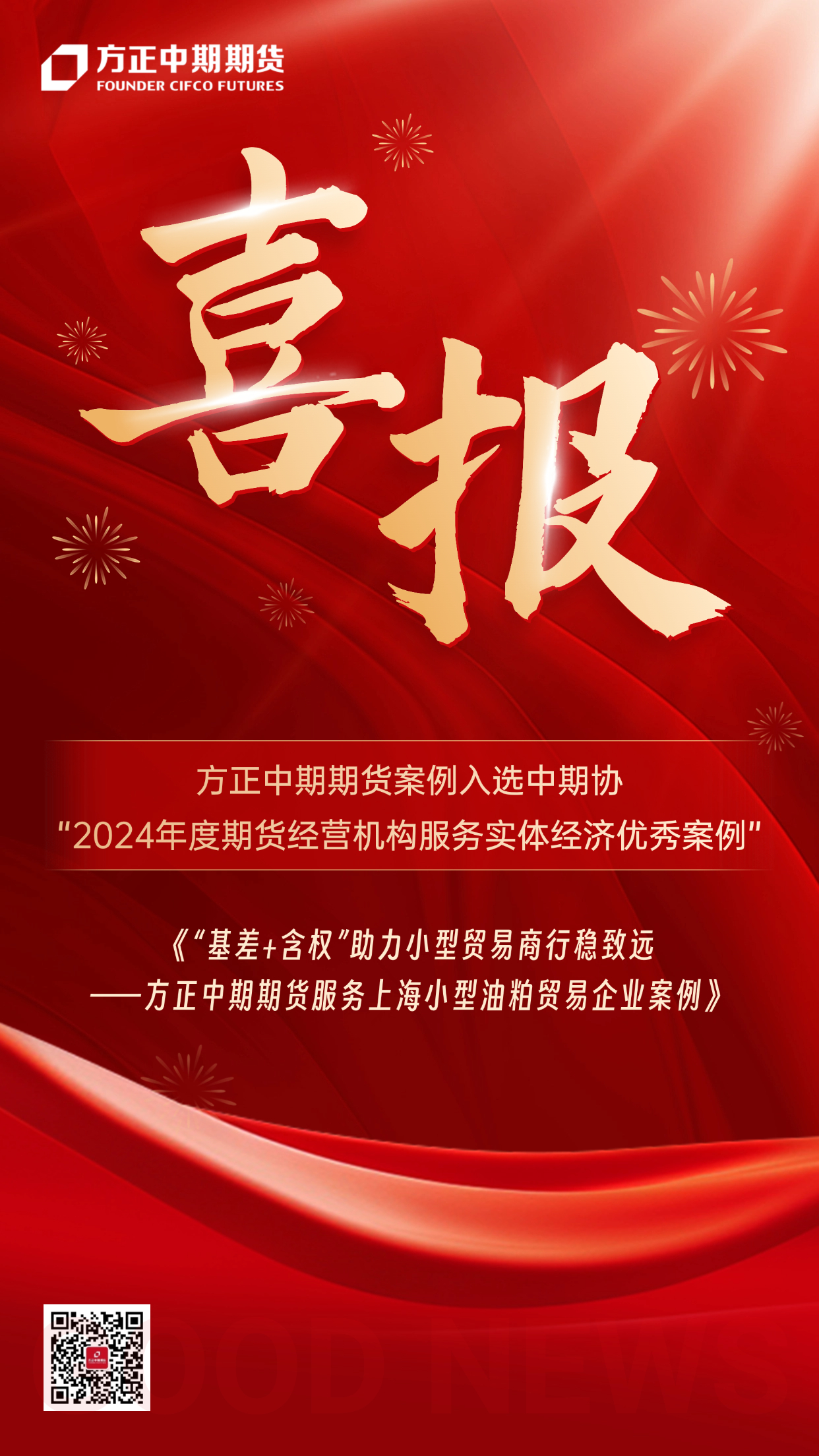 近日,中國期貨業(yè)協(xié)會(huì )公布“2024年度期貨經(jīng)營(yíng)機構服務(wù)實(shí)體經(jīng)濟優(yōu)秀案例”名單。方正中期期貨報送的案例《“基差+含權”助力小型貿易商行穩致遠——方正中期期貨服務(wù)上海小型油粕貿易企業(yè)案例》從214篇案例中脫穎而出,成功入圍“期貨經(jīng)營(yíng)機構服務(wù)實(shí)體經(jīng)濟優(yōu)秀案例庫”。