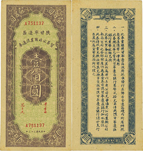 1943年國民黨政府發(fā)動(dòng)第三次反共高潮,加緊對邊區實(shí)行經(jīng)濟封鎖,邊區物資缺少,物價(jià)飛漲,為鞏固與穩定邊幣幣值,擴大貨幣流通范圍,1944年,邊區銀行以“陜甘寧邊區貿易公司”名義發(fā)行陜甘寧邊區貿易公司商業(yè)流通券,至1948年1月停止。