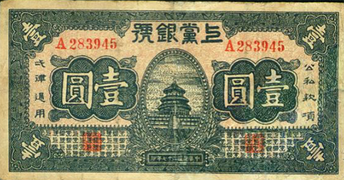 1938年,為了獨立自主地發(fā)展和鞏固根據地,嚴防蔣介石、閻錫山經(jīng)濟封鎖,晉東南抗日根據地在沁縣成立上黨銀號,發(fā)行“上黨票”。上黨票初發(fā)行時(shí)與法幣、晉鈔、銀元以及根據地各縣銀號發(fā)行的縣票同時(shí)流通于晉東南、晉南、晉中、冀南等部分縣域,1938年發(fā)行的面額有拾元、伍元、貳元、壹元、伍角、貳角伍分、貳角、壹角等8種票面10種版別。壹元票的主圖設計為體現根據地貨幣特色,天壇主圖的下面倒印有一“黨”字暗記。1940年初,“上黨銀號”結束,其財產(chǎn)并入“冀南銀行”時(shí),共發(fā)行上黨票300余萬(wàn)元。