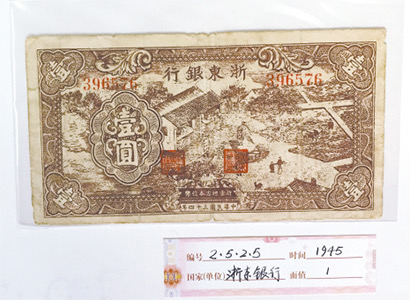 1945年4月1日,浙東銀行在浙江余姚成立,發(fā)行了18種36式浙東銀行幣。浙東銀行紙幣每元折合大米一市斤,不會(huì )貶值,在浙東人民群眾中享有很高的信譽(yù)。
